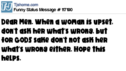 X is Dear Men. When a woman is upset, don't ask her what's wrong, but for GODS sake don't not ask her what's wrong either. Hope this helps.