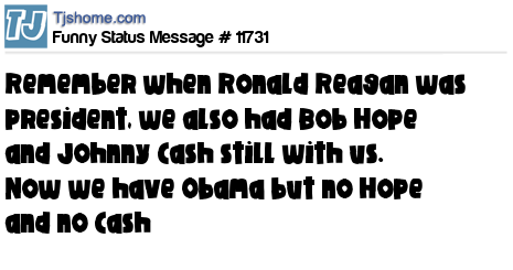 - # 29689 says, When Ronald Reagen was president we had Bob Hope and Johnny Cash. Now it's ONLY Obama with NO Hope and NO Cash.....!!!!
