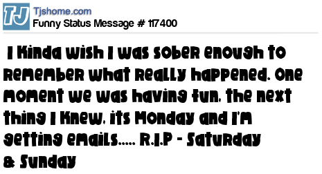X I kinda wish I was sober enough to remember what really happened. One moment we was having fun, the next thing I knew, its Monday and I'm getting emails..... R.I.P - Saturday & Sunday
