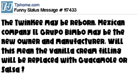 X The Twinkee may be reborn, Mexican company El Grupo Bimbo may be the new owner and manufacturer. Will this mean the vanilla cream filling will be replaced with Guacamole or Salsa ?