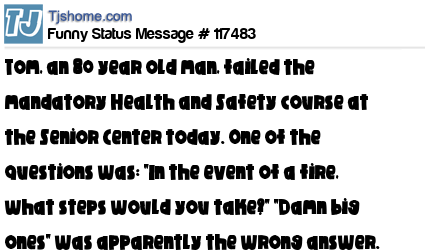 X says Tom, an 80 year old man, failed the mandatory Health and Safety course at the Senior Center today. One of the questions was: "In the event of a fire, what steps would you take?" "Damn big ones" was apparently the wrong answer.