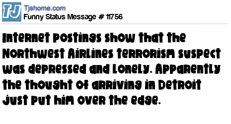 X Internet postings show that the Northwest Airlines terrorism suspect was depressed and lonely. Apparently the thought of arriving in Detroit just put him over the edge.