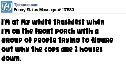 X I'm at my white trashiest when I'm on the front porch with a group of people trying to figure out why the cops are 2 houses down.
