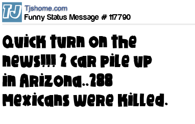 X is Quick turn on the news!!! 2 car pile up in Arizona..288 Mexicans were killed.