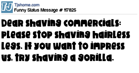 X Dear shaving commercials: please stop shaving hairless legs. If you want to impress us, try shaving a gorilla.
