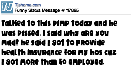 X is Talked to this pimp today and he was pissed. I said why are you mad? he said I got to provide health insurance for my hos cuz I got more than 50 employed.