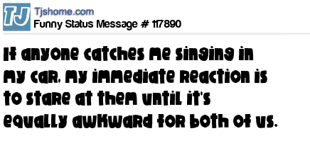 - # 81162 If anyone happens to catch me singing in my car, my immediate reaction is to stare at them back unblinking and still singing, until it is equally awkward for both of us.