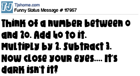 - # 95018 Think of a number 1 through 10. Double it, Subtract 1, add 20, multiply it by 5, add 2, divide by 2, close your eyes, dark, isn't it?