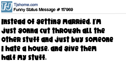 X Instead of getting married, I'm just gonna cut through all the other stuff and just buy someone I hate a house, and give them half my stuff.