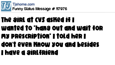 X says The girl at CVS asked if I wanted to "hang out and wait for my prescription" I told her I don't even know you and besides I have a girlfriend