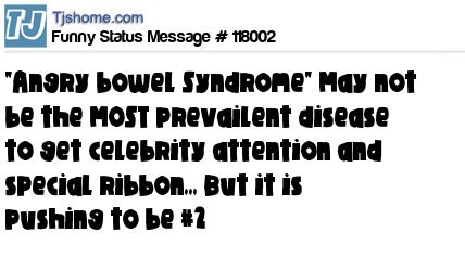 X "Angry bowel Syndrome" May not be the MOST prevailent disease to get celebrity attention and special ribbon,,, But it is pushing to be #2