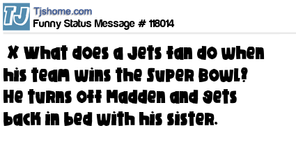 X says X What does a Jets fan do when his team wins the Super Bowl? He turns off Madden and gets back in bed with his sister.