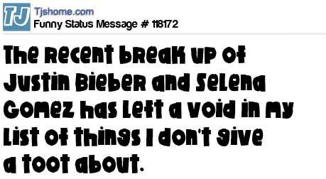 X is The recent break up of Justin Bieber and Selena Gomez has left a void in my list of things I don't give a toot about.