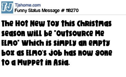 X The Hot New Toy this Christmas season will be "Outsource Me Elmo" Which is simply an empty box as Elmo's job has now gone to a Muppet in Asia.
