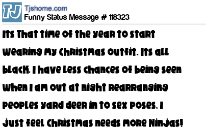 X says Its That time of the year to start wearing my Christmas outfit. Its all black, I have less chances of being seen when I am out at night rearranging peoples yard deer in to sex poses. I just feel Christmas needs more Ninjas!