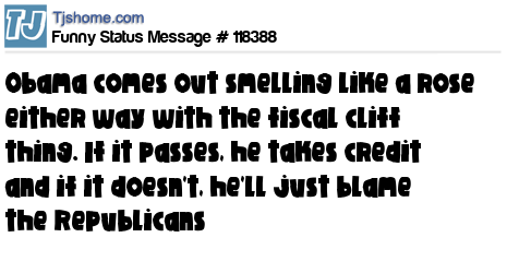 X Obama comes out smelling like a rose either way with the fiscal cliff thing. If it passes, he takes credit and if it doesn't, he'll just blame the Republicans