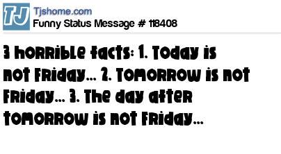 - # 126770 4 horrible facts: Today is not Friday. Tomorrow is not Friday. The day after Tomorrow is not Friday. Even the day after that is not Friday.