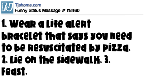 X 1. Wear a life alert bracelet that says you need to be resuscitated by pizza. 2. Lie on the sidewalk. 3. Feast.