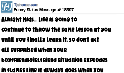 X Alright kids... Life is going to continue to throw the same lesson at you until you finally learn it, so don't act all surprised when your boyfriend/girlfriend situation explodes in flames like it always does when you keep choosing the same type of clowns
