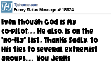 X Even though God is my co-pilot..... He also, is on the "no-fly" list.. Thanks Sadly, to His ties to several extremist groups..... You jerks