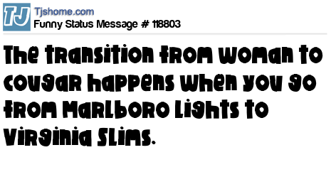 X is The transition from woman to cougar happens when you go from Marlboro Lights to Virginia Slims.