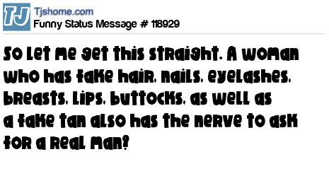 X is So let me get this straight. A woman who has fake hair, nails, eyelashes, breasts, lips, buttocks, as well as a fake tan also has the nerve to ask for a real man?