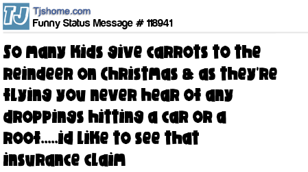 X says so many kids give carrots to the reindeer on Christmas & as they're flying you never hear of any droppings hitting a car or a roof.....id like to see that insurance claim