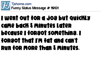 X says I went out for a jog but quickly came back 5 minutes later because I forgot something. I forgot that I'm fat and can't run for more than 5 minutes.
