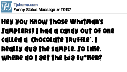 X Hey you know those Whitman's Samplers? I had a candy out of one called a Chocolate Truffle". I really dug the sample. So like, where do I get the big fu*ker?