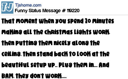 X That moment when you spend 20 minutes making all the christmas lights work, then putting them nicely along the ceiling, then stand back to look at the beautiful setup up.. Plug them in... And BAM, they don't work....\