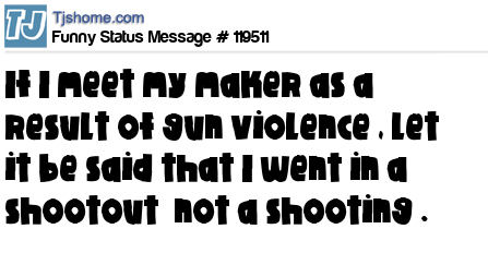 X is If I meet my maker as a result of gun violence , let it be said that I went in a shootout not a shooting .