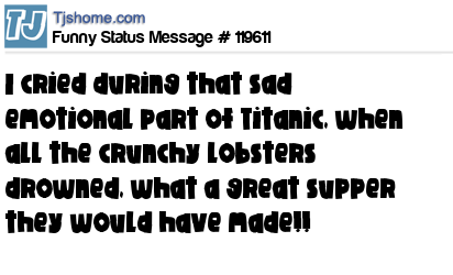 X is I cried during that sad emotional part of Titanic, when all the crunchy lobsters drowned, what a great supper they would have made!!