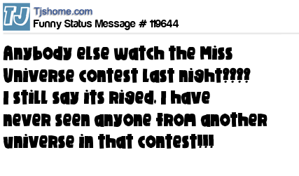 X Anybody else watch the Miss Universe contest last night???? I still say its riged, I have never seen anyone from another universe in that contest!!!