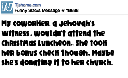 X My coworker, a Jehovah's Witness,, wouldn't attend the Christmas luncheon.. She took her bonus check though,, Maybe she's donating it to her church.
