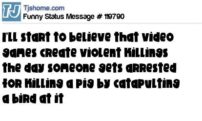 - # 121116 I'll start to believe video games cause people to be violent when I see someone get arrested for killing a pig by slingshotting a bird at it.