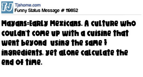X Mayans=Early Mexicans. A culture who couldn't come up with a cuisine that went beyond using the same 7 ingredients, yet alone calculate the end of time.