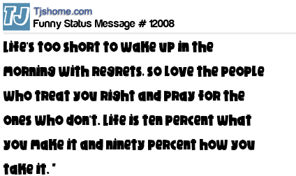 - # 41465 Life is too short to wake up with regrets.So love the people who treat you right. Forget about those who don't. Believe everything happens for a reason. If you get a chance, take it, and if it changes your life, let it. Enjoy life: you only have one!