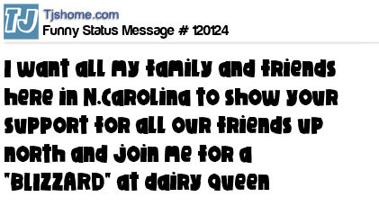 X I want all my family and friends here in N.Carolina to show your support for all our friends up north and join me for a "BLIZZARD" at dairy queen