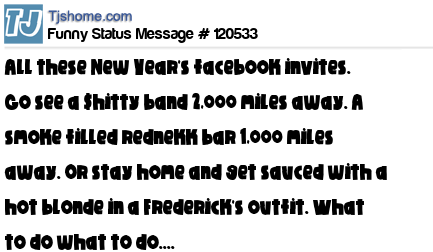 X All these New Year's facebook invites. Go see a $hitty band 2,000 miles away. A smoke filled rednekk bar 1,000 miles away. Or stay home and get sauced with a hot blonde in a Frederick's outfit. What to do what to do....