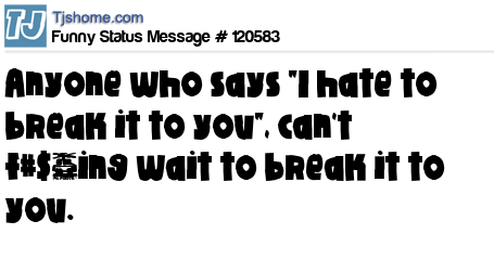 - # 169330 People that say " I hate to break it to you" can't wait to break it to you!
