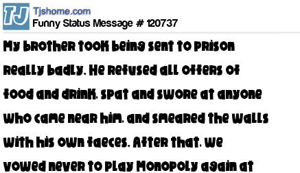- # 210949 My brother took going to jail bad. He wouldn't eat, smeared feces on the wall, swore and spit at everyone. That's it, I'm never playing Monopoly with him again.
