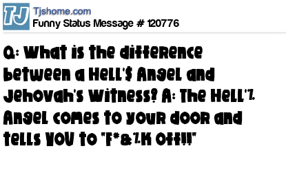 X Q: What is the difference between a Hell'$ Angel and Jehovah's Witness? A: The Hell'% Angel comes to your door and tells YOU to "F*&%k Off!!"