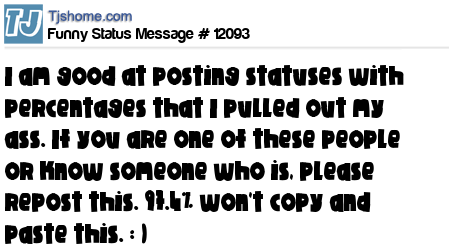 X I am good at posting statuses with percentages that I pulled out my ass. If you are one of these people or know someone who is, please repost this. 97.4% won't copy and paste this. : )