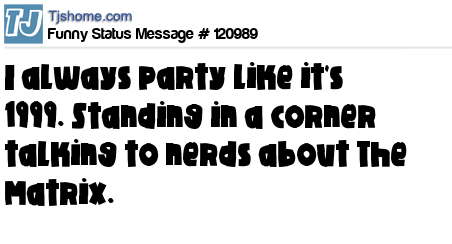 X says I always party like it's 1999. Standing in a corner talking to nerds about The Matrix.