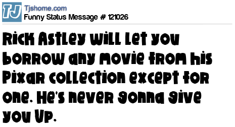 - # 47963 called Rick Astley last night to see if I could borrow some of his Disney Pixar dvds. He said "sure, no problem, you can have anything you want", but I'm pretty sure he's never gonna give me "Up."
