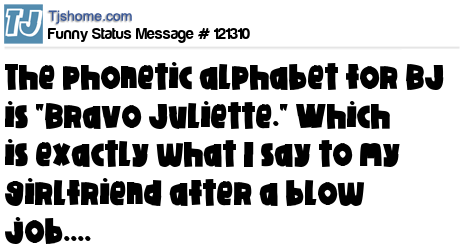 X The phonetic alphabet for BJ is "Bravo Juliette." Which is exactly what I say to my girlfriend after a blow job....