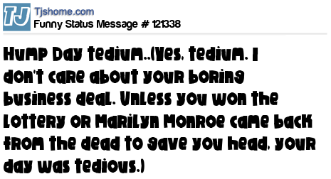 X Hump Day tedium..(Yes, tedium. I don't care about your boring business deal. Unless you won the lottery or Marilyn Monroe came back from the dead to gave you head, your day was tedious.)