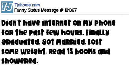 - # 138066 Didn’t have internet on my phone for the past few hours. Finally graduated, got married, lost some weight, read 17 books and showered.