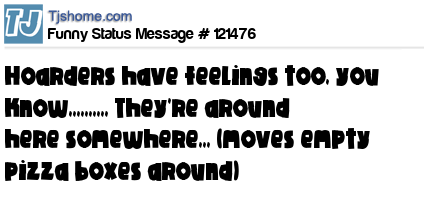 X Hoarders have feelings too, you know,,,,,,,,,, They're around here somewhere,,, (moves empty pizza boxes around)