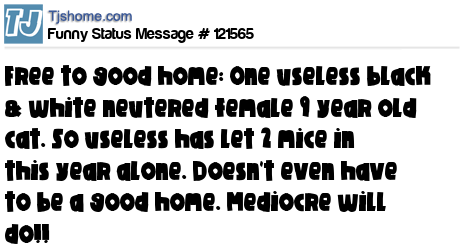 X Free to good home: One useless black & white neutered female 9 year old cat. So useless has let 2 mice in this year alone. Doesn't even have to be a good home. Mediocre will do!!